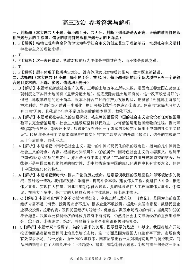 浙江省七彩阳光新高考研究联盟2023-2024学年高三上学期返校联考 政治答案
