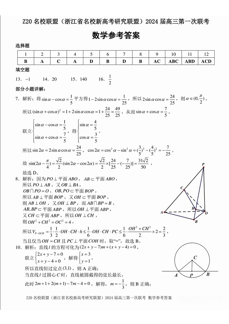 2024届Z20名校联盟(浙江省名校新高考研究联盟)高三第一次联考 数学答案