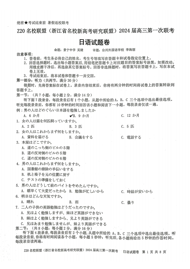 2024届Z20名校联盟(浙江省名校新高考研究联盟)高三第一次联考 日语