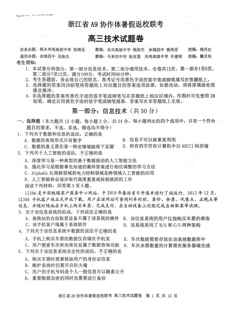 浙江省A9协作体2023-2024学年高三暑假返校联考 技术