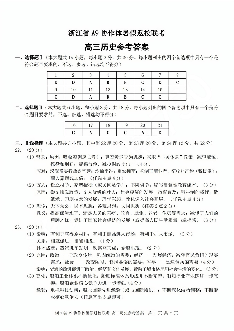 浙江省A9协作体2023-2024学年高三暑假返校联考 历史答案