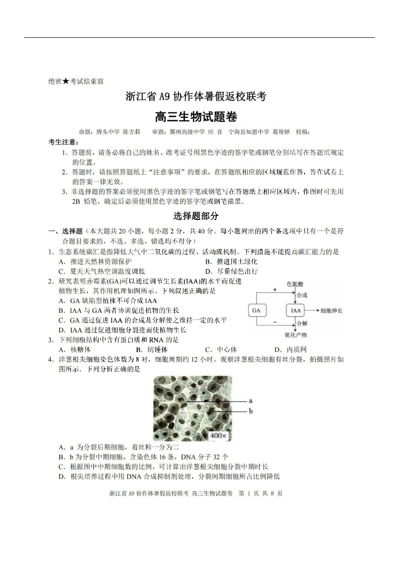 浙江省A9协作体2023-2024学年高三暑假返校联考 生物