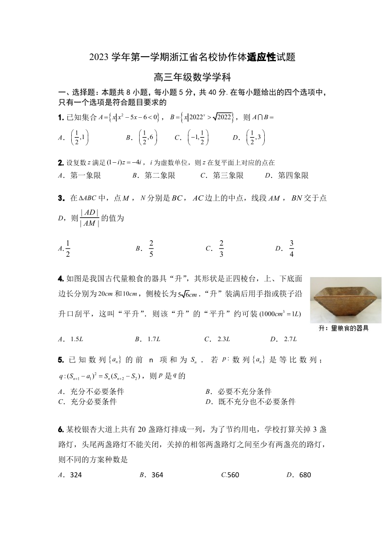 浙江省名校协作体2023-2024学年高三上学期开学适应性考试 数学
