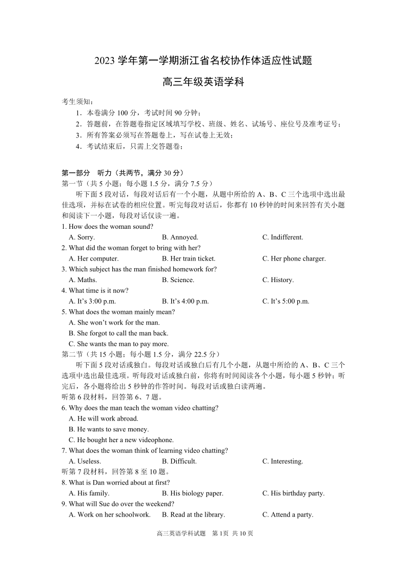浙江省名校协作体2023-2024学年高三上学期开学适应性考试 英语