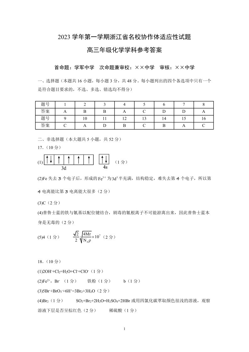 浙江省名校协作体2023-2024学年高三上学期开学适应性考试 化学答案