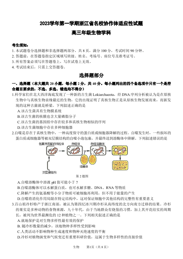 浙江省名校协作体2023-2024学年高三上学期开学适应性考试 生物