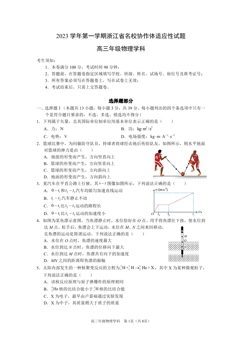 浙江省名校协作体2023-2024学年高三上学期开学适应性考试 物理