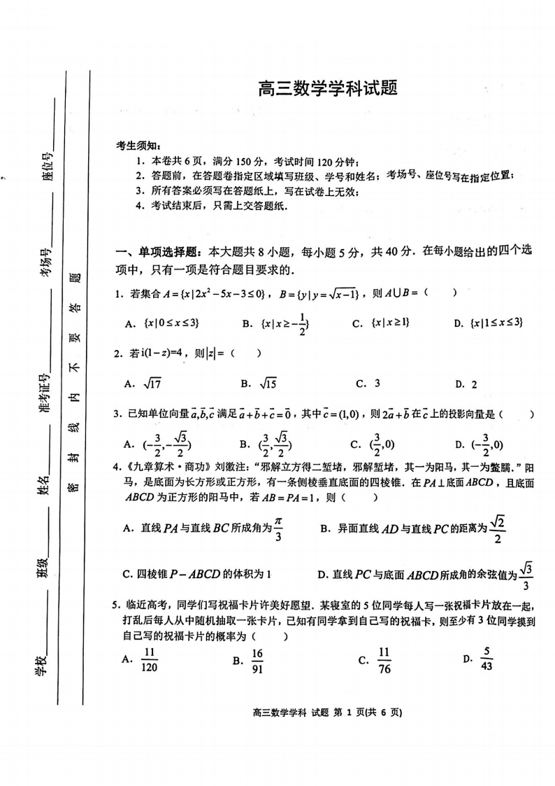 浙江省北斗星盟2023届高三下学期5月联考 数学试卷及答案