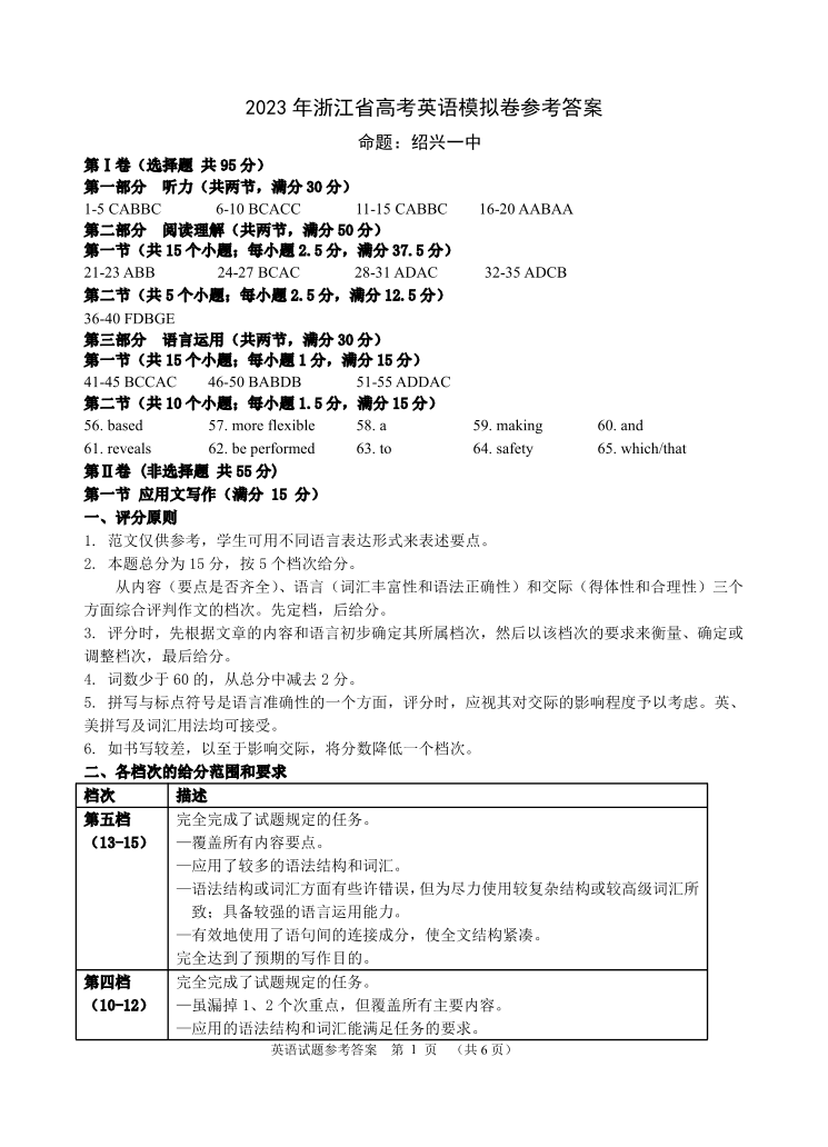 2023年浙江省高考四校联盟高三模拟卷 英语答案