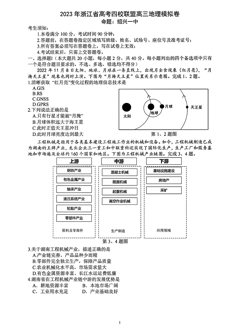 2023年浙江省高考四校联盟高三模拟卷 地理