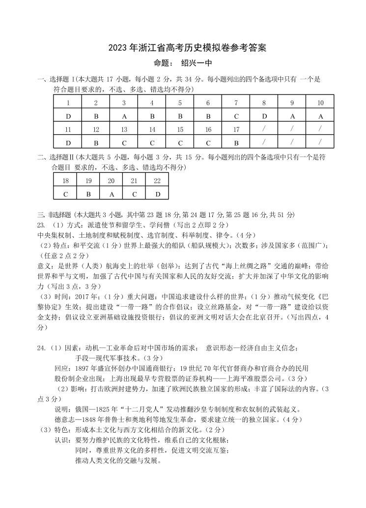 2023年浙江省高考四校联盟高三模拟卷 历史答案