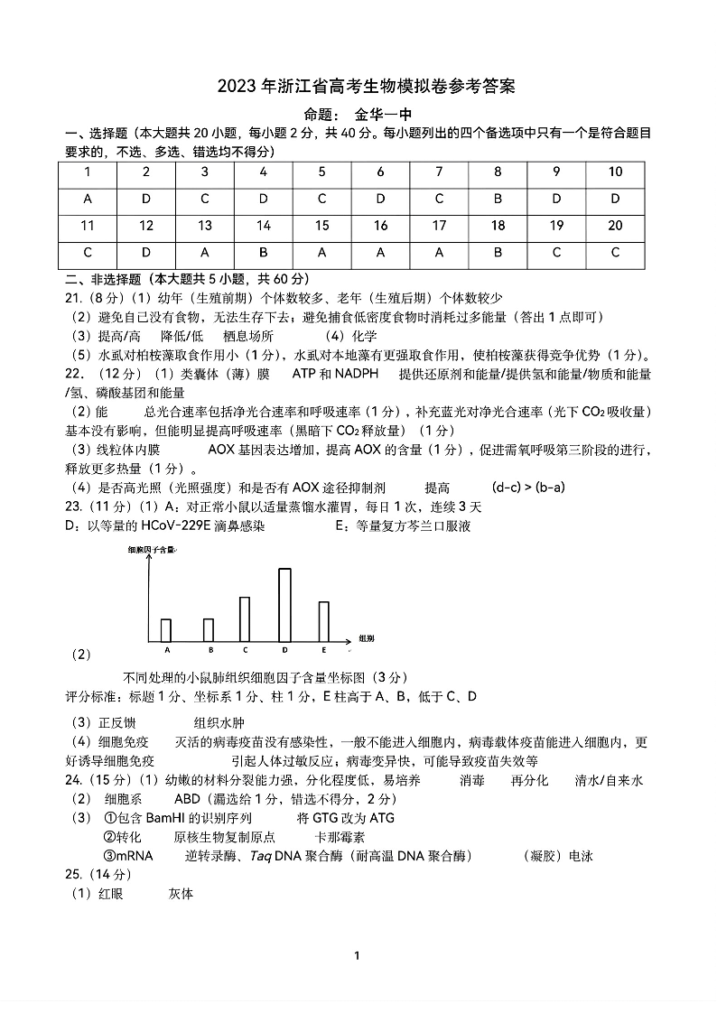 2023年浙江省高考四校联盟高三模拟卷 生物答案