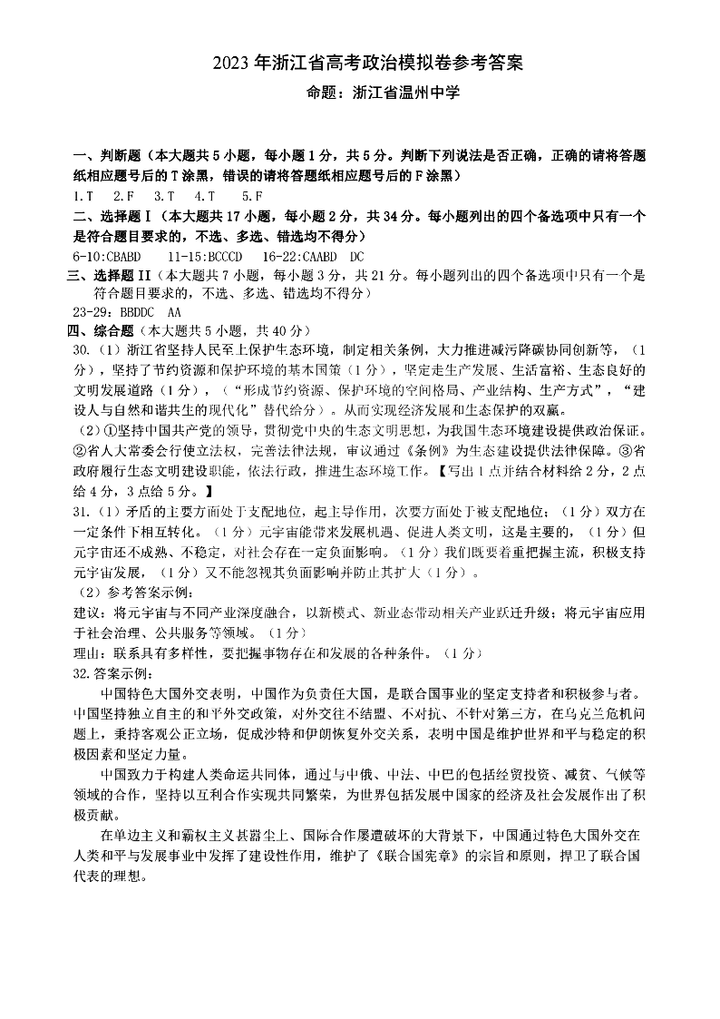 2023年浙江省高考四校联盟高三模拟卷 政治答案
