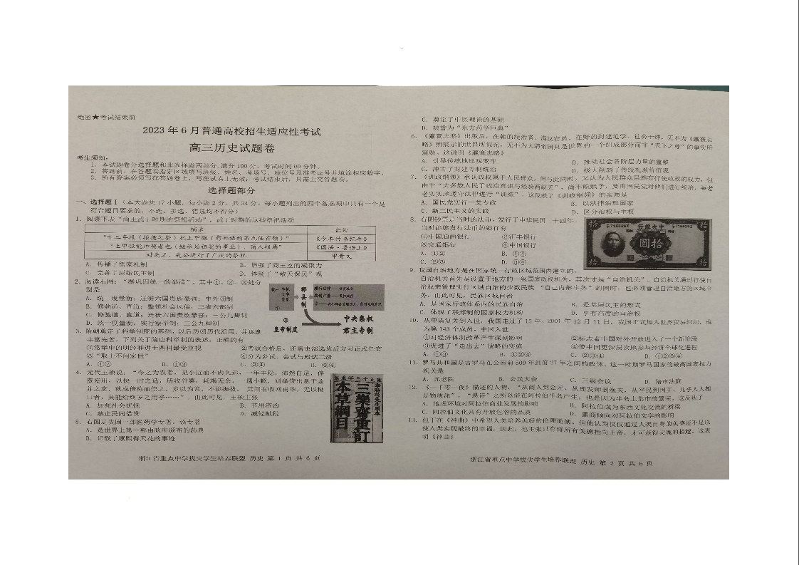 2023届浙江省重点中学拔尖学生培养联盟高三6月适应性考试历史试题
