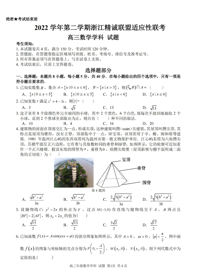 2023届第二学期浙江精诚联盟适应性联考试题 数学