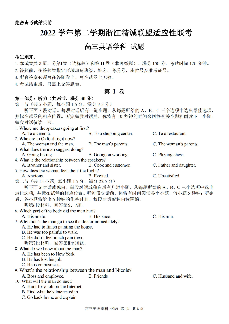 2023届第二学期浙江精诚联盟适应性联考试题 英语