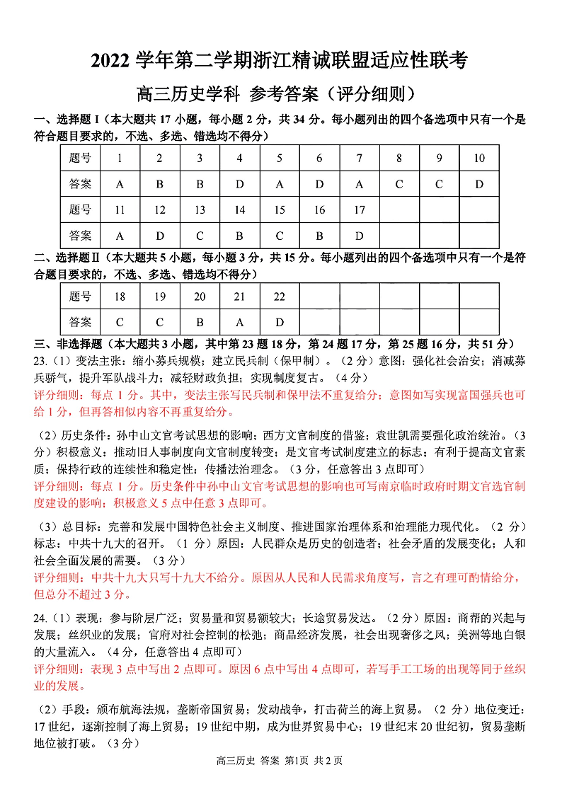 高三历史参考答案与解析