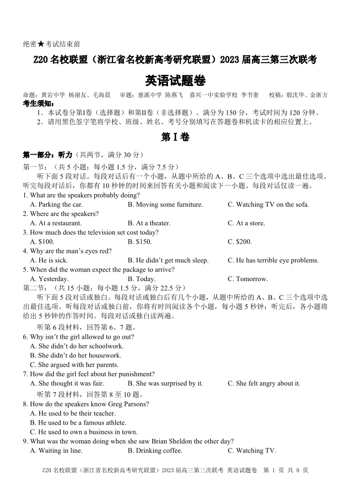 浙江Z20名校联盟(浙江省名校新高考研究联盟)2023届高三第三次联考 英语试卷及答案