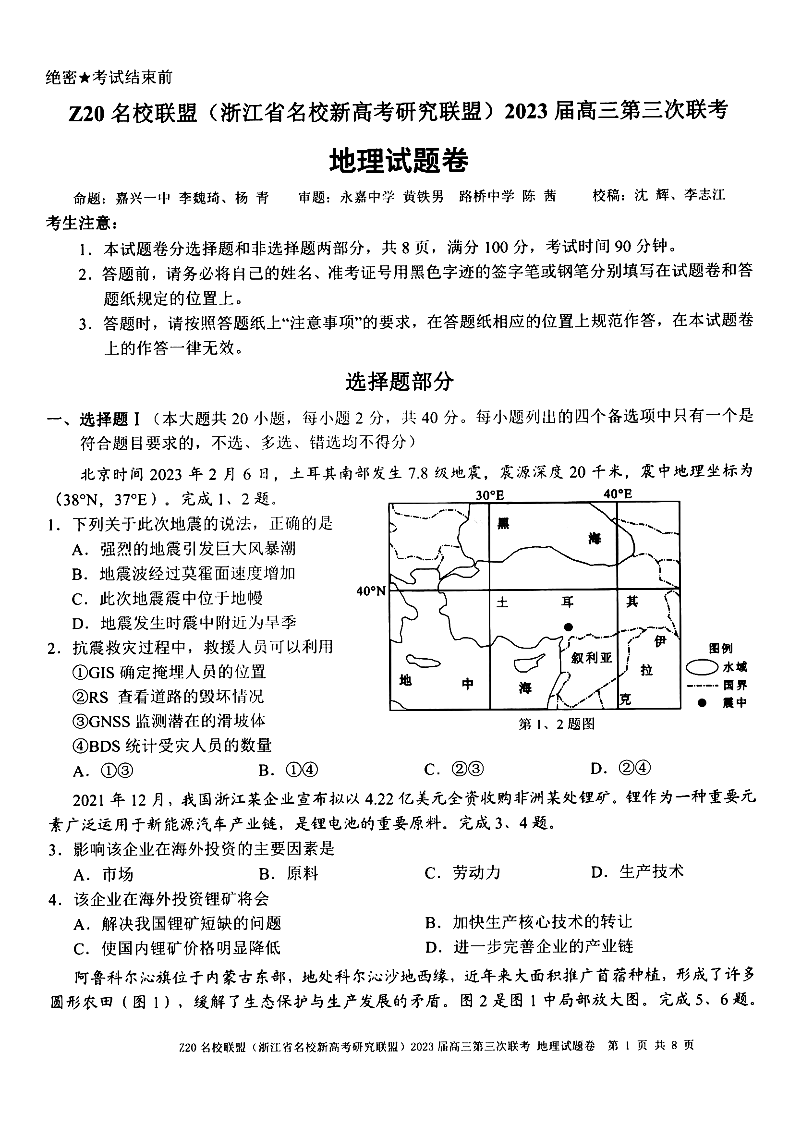 浙江Z20名校联盟(浙江省名校新高考研究联盟)2023届高三第三次联考 地理试卷及答案
