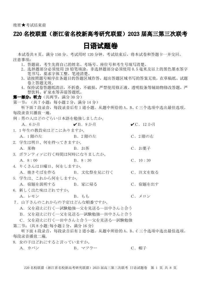 浙江Z20名校联盟(浙江省名校新高考研究联盟)2023届高三第三次联考 日语试卷及答案