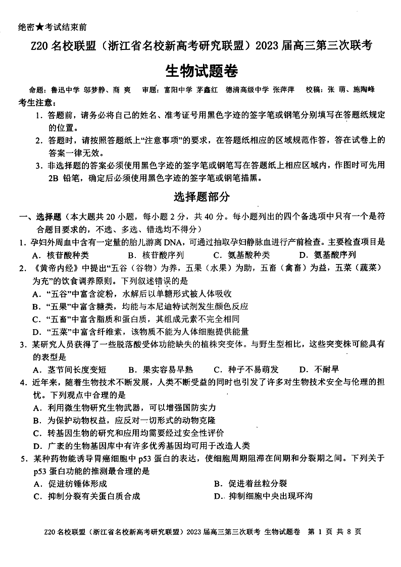 浙江Z20名校联盟(浙江省名校新高考研究联盟)2023届高三第三次联考 生物试卷及答案