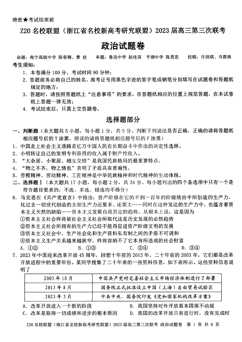 浙江Z20名校联盟(浙江省名校新高考研究联盟)2023届高三第三次联考 政治试卷及答案