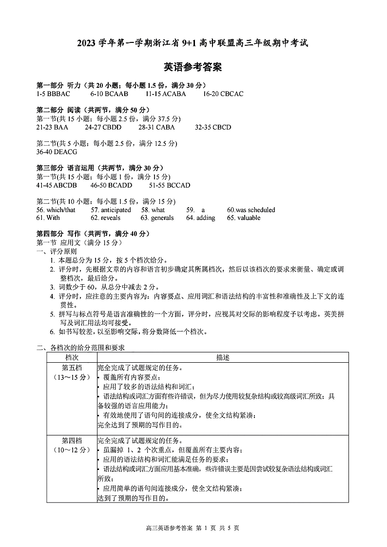 浙江省9+1高中联盟2023-2024学年高三上学期期中联考 英语参考答案