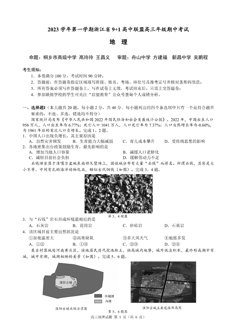 浙江省9+1高中联盟2023-2024学年高三上学期期中联考 地理