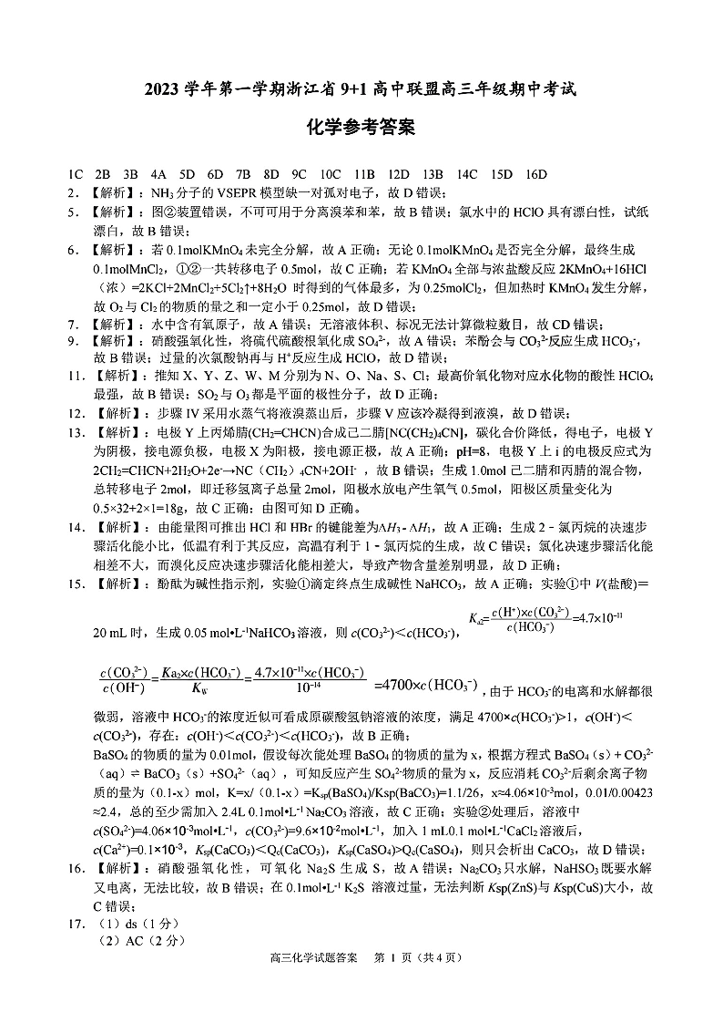 浙江省9+1高中联盟2023-2024学年高三上学期期中联考 化学参考答案