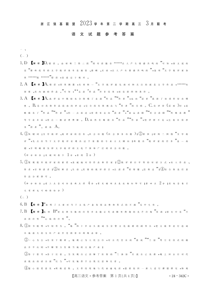 浙江省强基联盟2023-2024学年高三下学期3月联考 语文参考答案