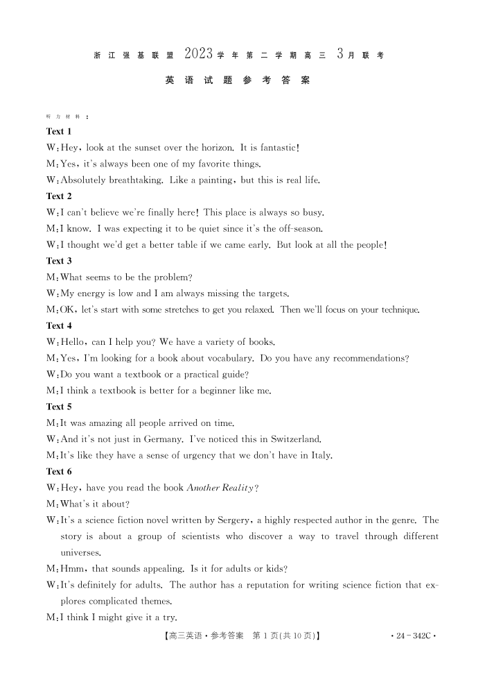 浙江省强基联盟2023-2024学年高三下学期3月联考 英语参考答案
