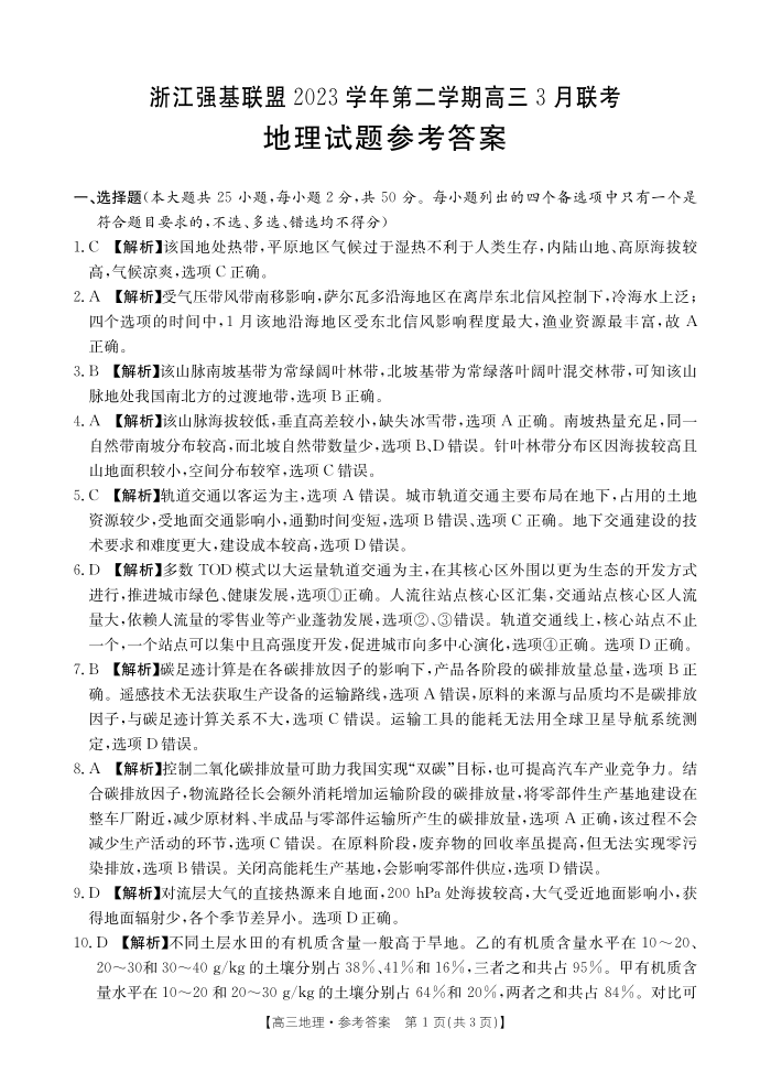 浙江省强基联盟2023-2024学年高三下学期3月联考 地理参考答案