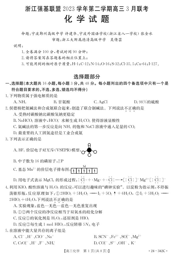 浙江省强基联盟2023-2024学年高三下学期3月联考 化学