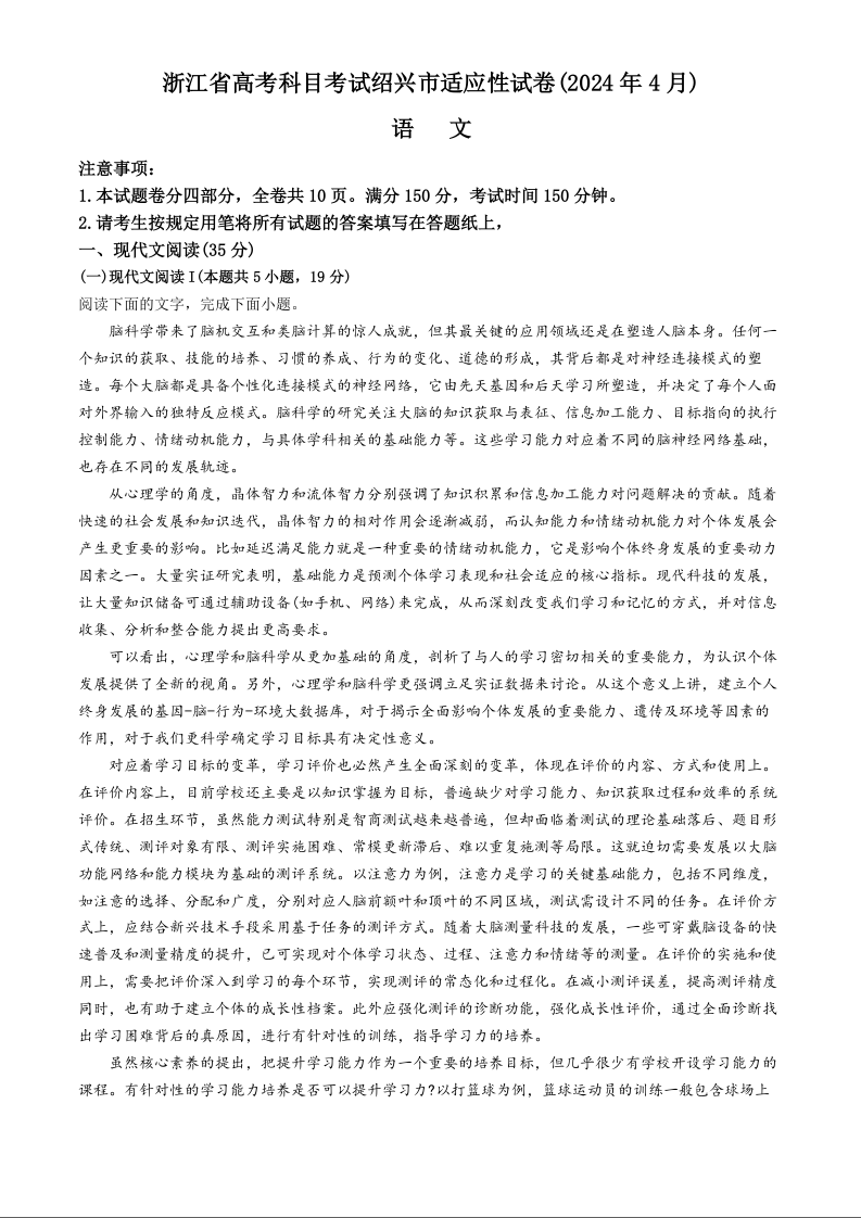 2024届浙江省绍兴市高三高考4月适应性考试(二模)语文