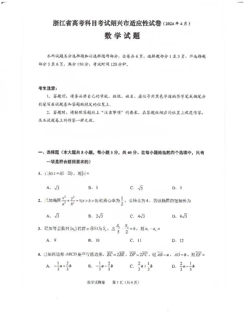 2024届浙江省绍兴市高三高考4月适应性考试(二模)数学