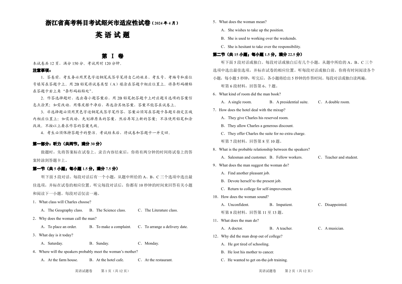 2024届浙江省绍兴市高三高考4月适应性考试(二模)英语