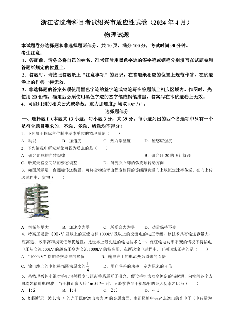 2024届浙江省绍兴市高三高考4月适应性考试(二模)物理