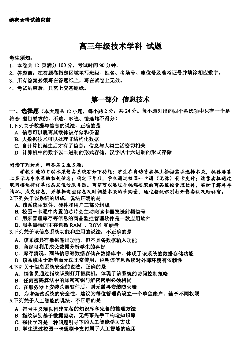 浙江省北斗星盟2024届高三下学期5月适应性联考+技术