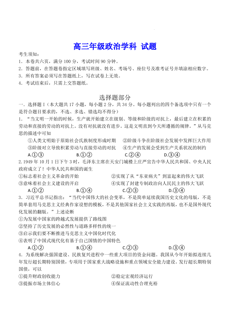 浙江省北斗星盟2024届高三下学期5月适应性联考+政治