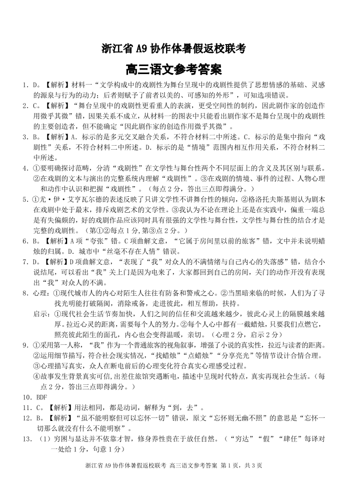 浙江省A9协作体2025届2024年8月高三年级八月暑期返校联考+语文答案