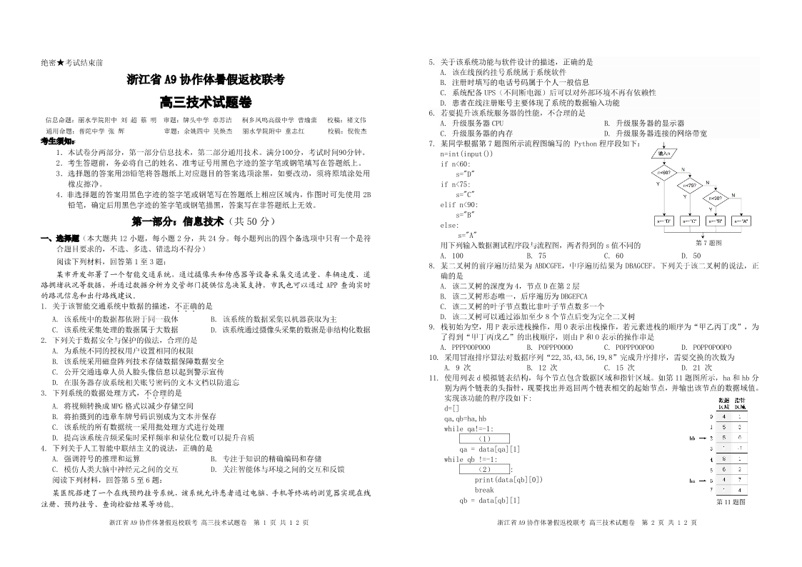 浙江省A9协作体2025届2024年8月高三年级八月暑期返校联考+技术