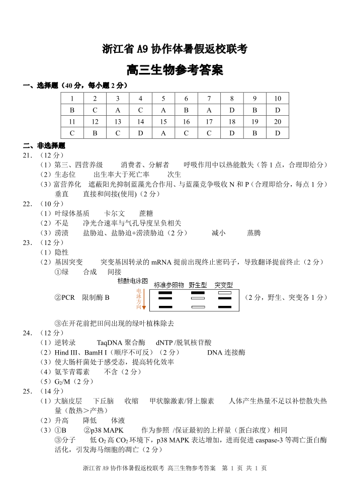 浙江省A9协作体2025届2024年8月高三年级八月暑期返校联考+生物答案