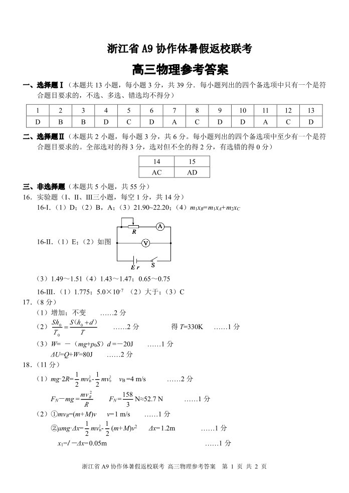浙江省A9协作体2025届2024年8月高三年级八月暑期返校联考+物理答案