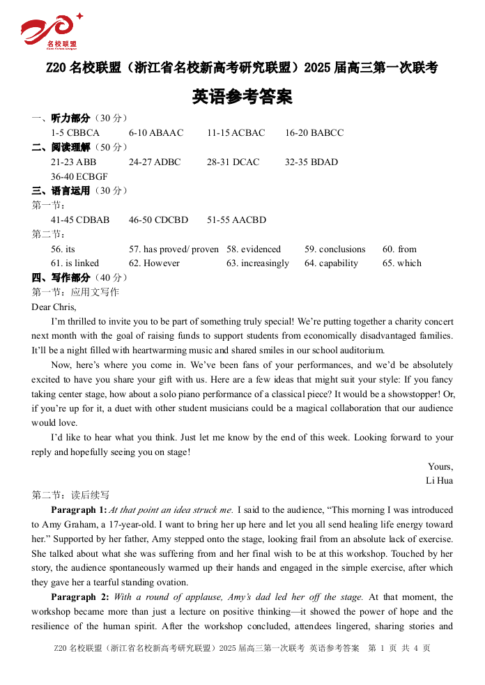 浙江省Z20名校联盟(浙江省名校新高考研究联盟)2025届高三第一次联考+英语答案