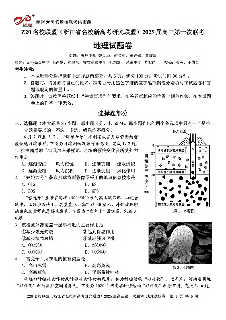 浙江省Z20名校联盟(浙江省名校新高考研究联盟)2025届高三第一次联考+地理