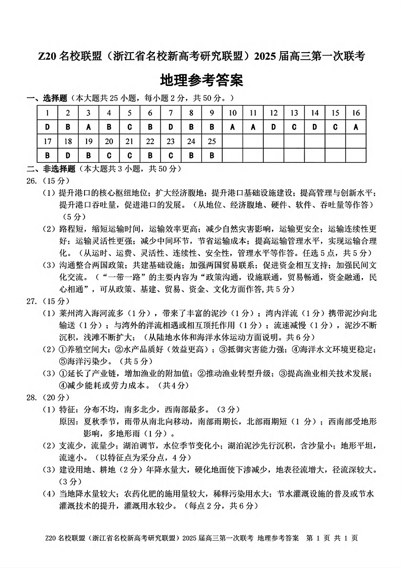 浙江省Z20名校联盟(浙江省名校新高考研究联盟)2025届高三第一次联考+地理答案