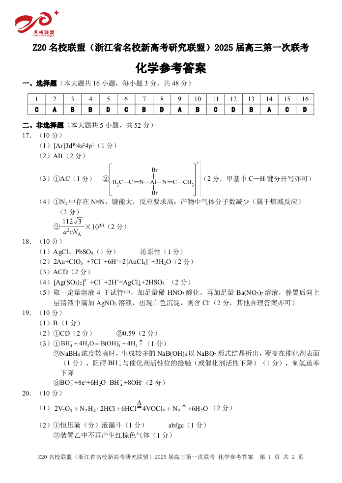 浙江省Z20名校联盟(浙江省名校新高考研究联盟)2025届高三第一次联考+化学答案