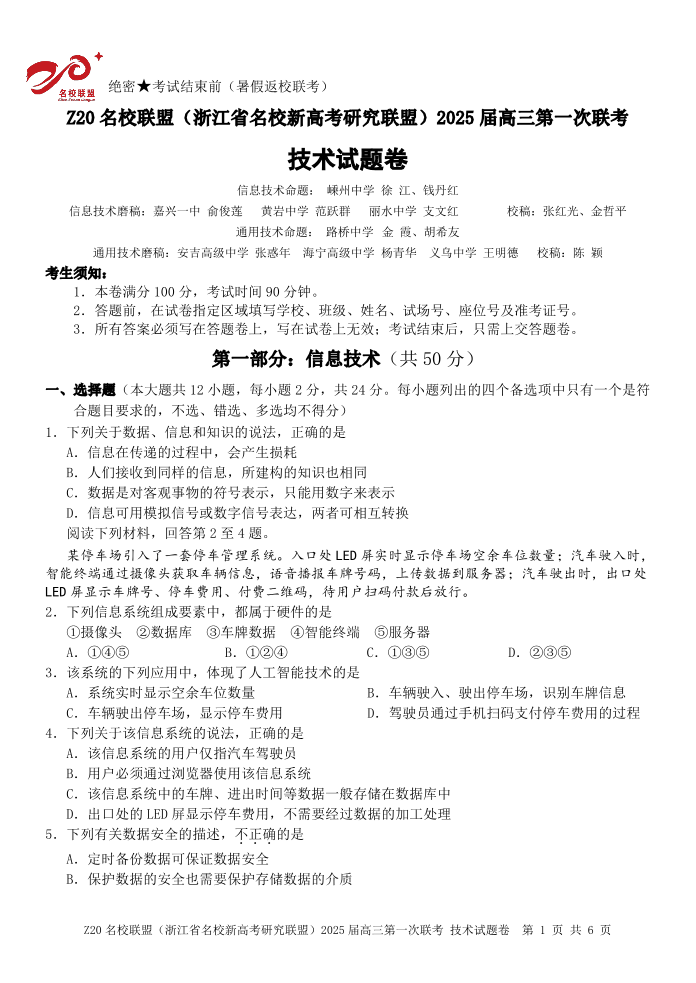 浙江省Z20名校联盟(浙江省名校新高考研究联盟)2025届高三第一次联考+技术