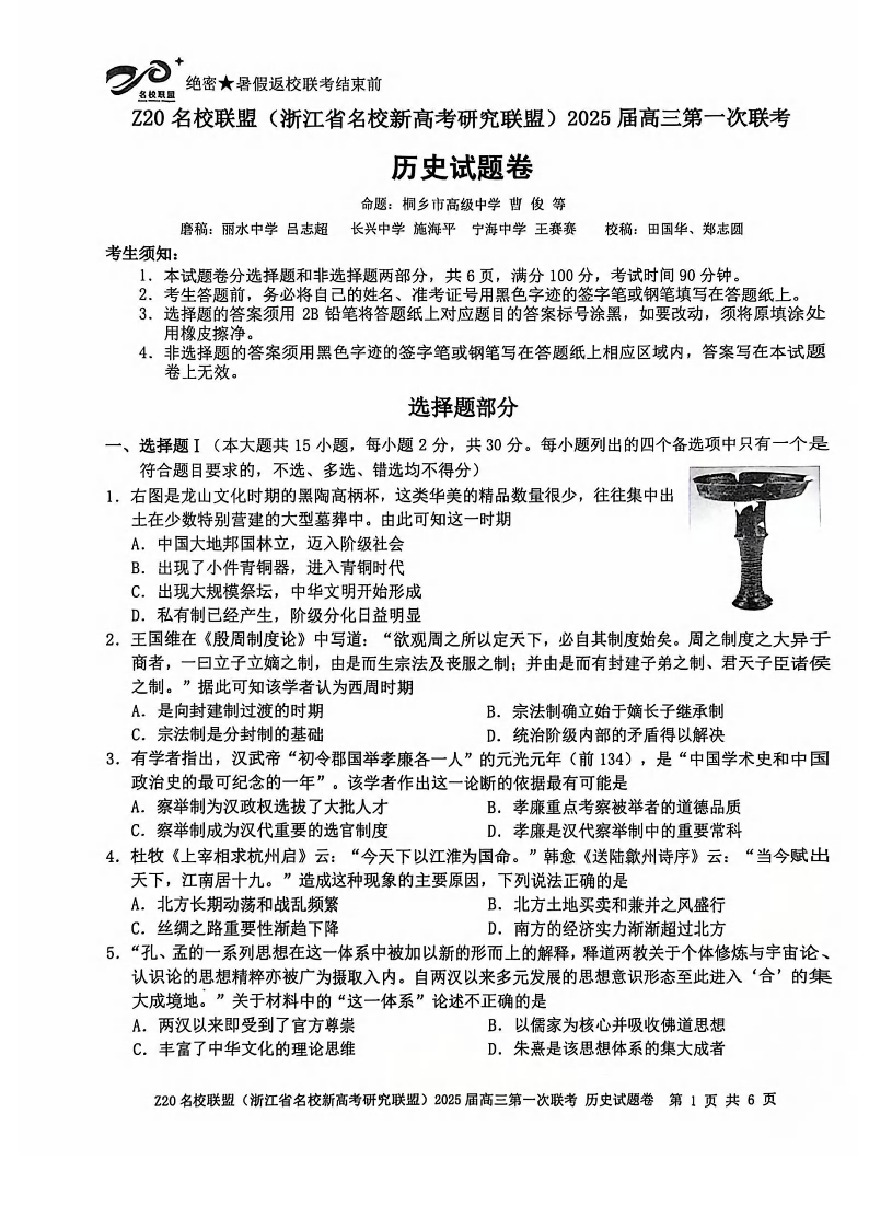 浙江省Z20名校联盟(浙江省名校新高考研究联盟)2025届高三第一次联考+历史