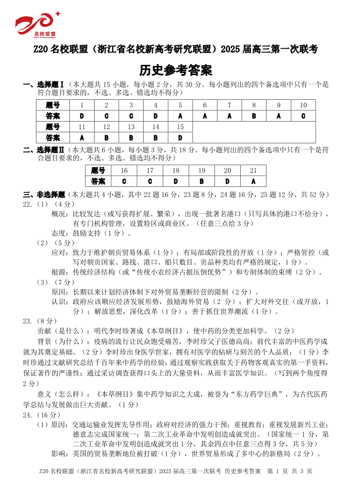 浙江省Z20名校联盟(浙江省名校新高考研究联盟)2025届高三第一次联考+历史答案